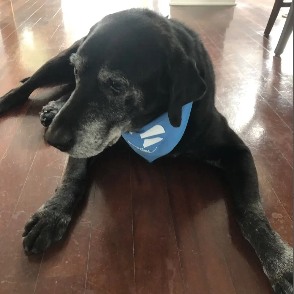 A cozy, easy-to-wear bandana with the classic Swede Love heart design. Scandinavian charm for your four-legged best friend. Here is Sofie Blue Riddell showing off her Swedish style. She was, after all, the first CDO—Chief Dog Officer (great with security).
